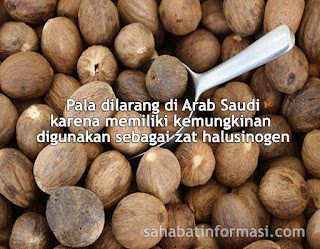 - Pala dilarang di Arab Saudi karena memiliki kemungkinan digunakan sebagai zat halusinogen